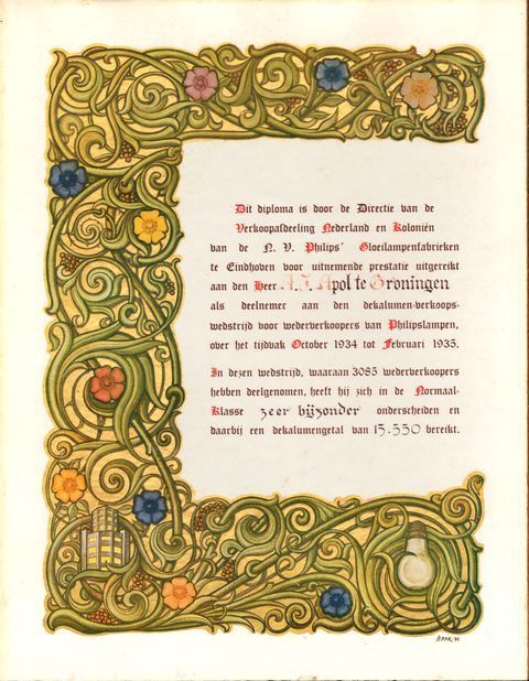 Dit diploma is door de Directie van de Verkoopafdeling Nederland en Koloniën van de N.V. Philips' Gloeilampenfabrieken te Eindhoven voor uitnemende prestatie uitgereikt aan den Heer A.J. Apol te Groningen |