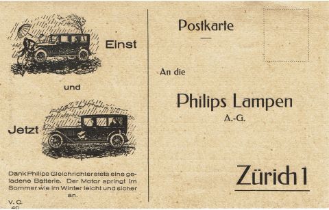 Op de achterzijde van de kaart kunnen gelijkrichters besteld worden bij Philips Lampen in Zürich |