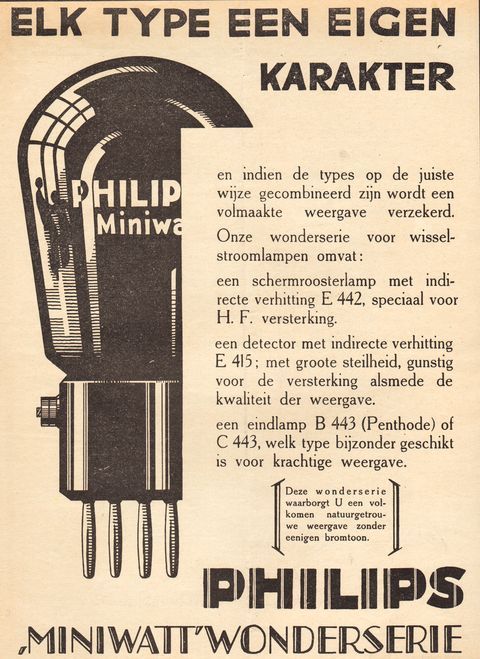 Opschrift: ELK TYPE EEN EIGEN KARAKTER PHILIPS 'MINIWATT' WONDERSERIE