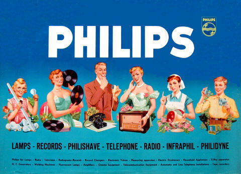 Opschrift: PHILIPS LAMPS-RECORDS-PHILISHAVE-TELEPHONE-RADIO-INFRAPHIL-PHILIDYNE