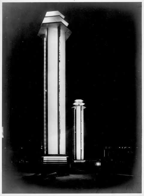 Foto afsluitpaal van de verlichting op het Damrak te Amsterdam tijdens de Edison Lichtweek, 1929.