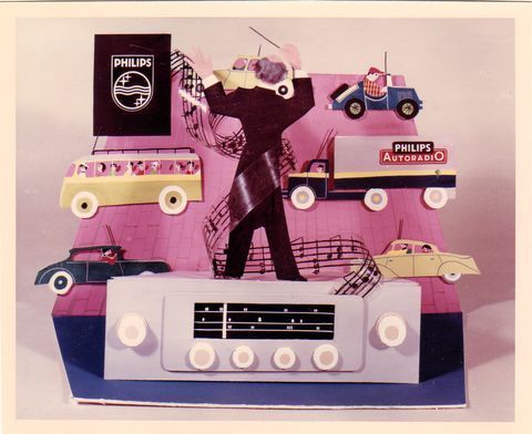 Foto van etalagekarton met reclame voor autoradio, ca. 1956