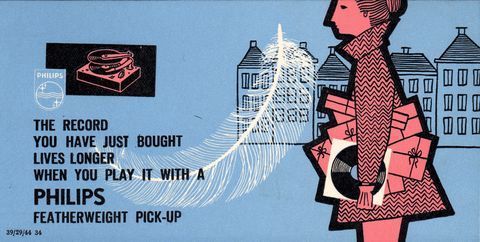 THE RECORD YOU HAVE JUST BOUGHT LIVES LONGER WHEN YOU PLAY IT WITH A PHILIPS FEATHERWEIGHT PICK-UP |