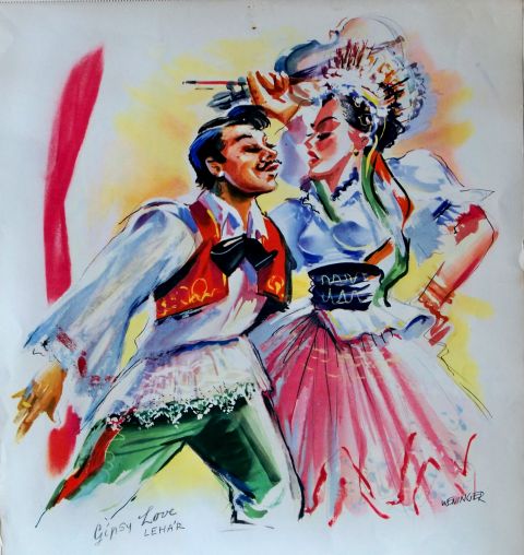 Illustratie op kalenderblad met reclame voor radio, grammofoon en TV, 1954