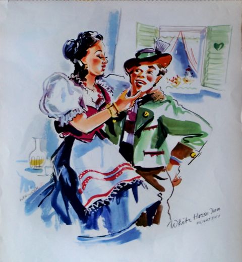 Illustratie op kalenderblad met reclame voor elektronische microscopen, 1954