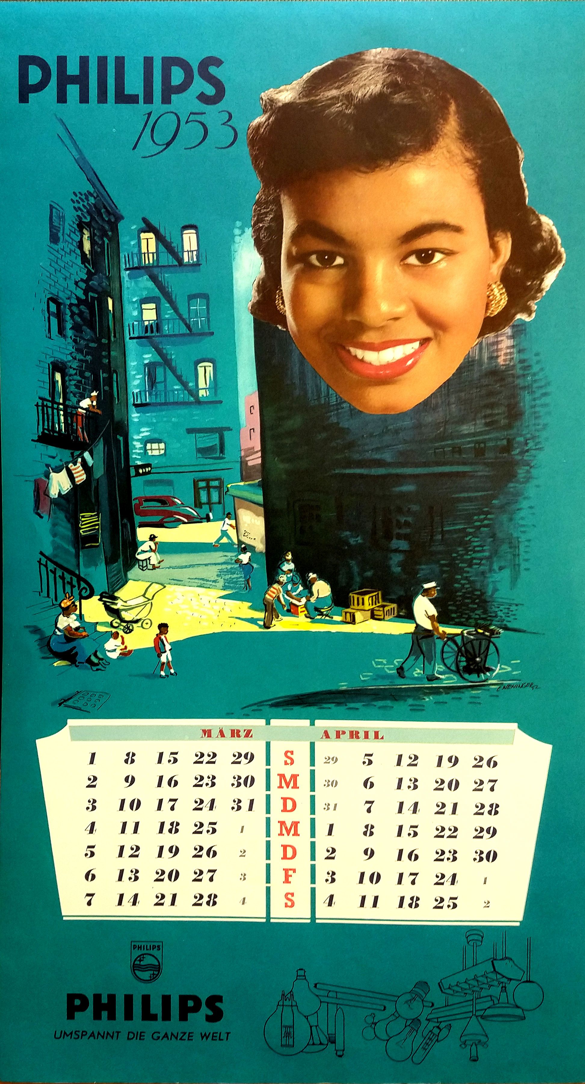 Kalenderblad 1953 maart-april met reclame voor verlichting, 1952