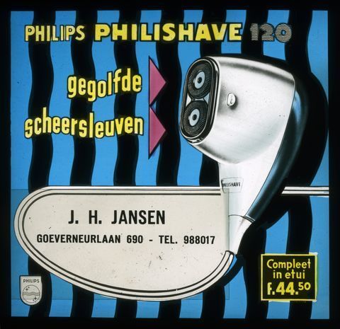 Projectieplaatje met reclame voor scheerapparaten, ca. 1957