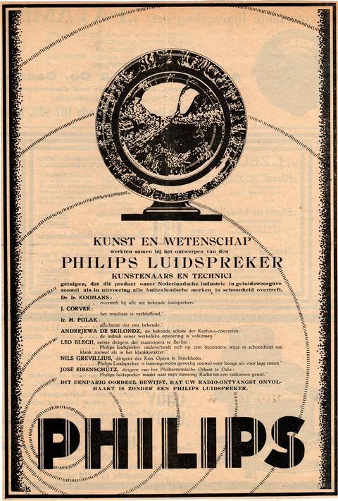Opschrift: KUNST EN WETENSCHAP werkten samen bij het ontwerpen van den PHILIPS LUIDSPREKER