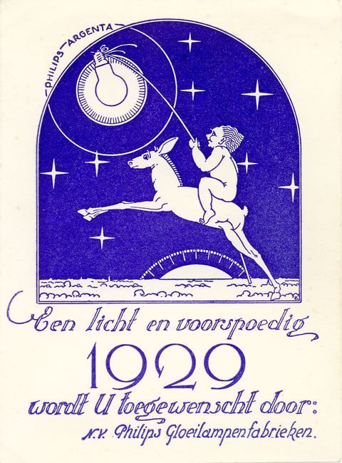 Een licht en voorspoedig 1929 wordt U toegewenscht door: N.V. Philips Gloeilampenfabrieken. |