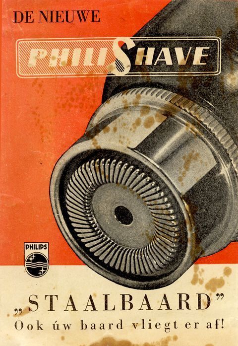 Opschrift: DE NIEUWE PHILISHAVE "STAALBAARD" Ook úw baard vliegt er af!